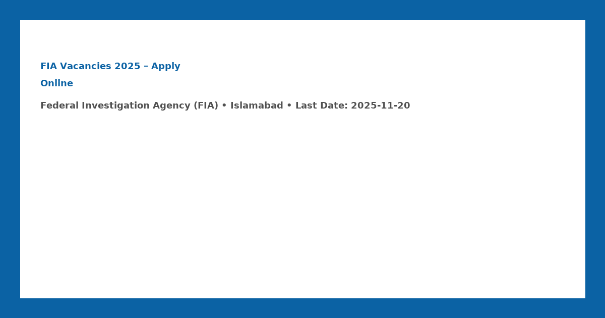 FIA Vacancies 2025 – Apply Online — Federal Investigation Agency (FIA) has announced vacancies based in Islamabad. Interested candidates who meet the eligibility criteria are encouraged to apply online before 2025-11-20.